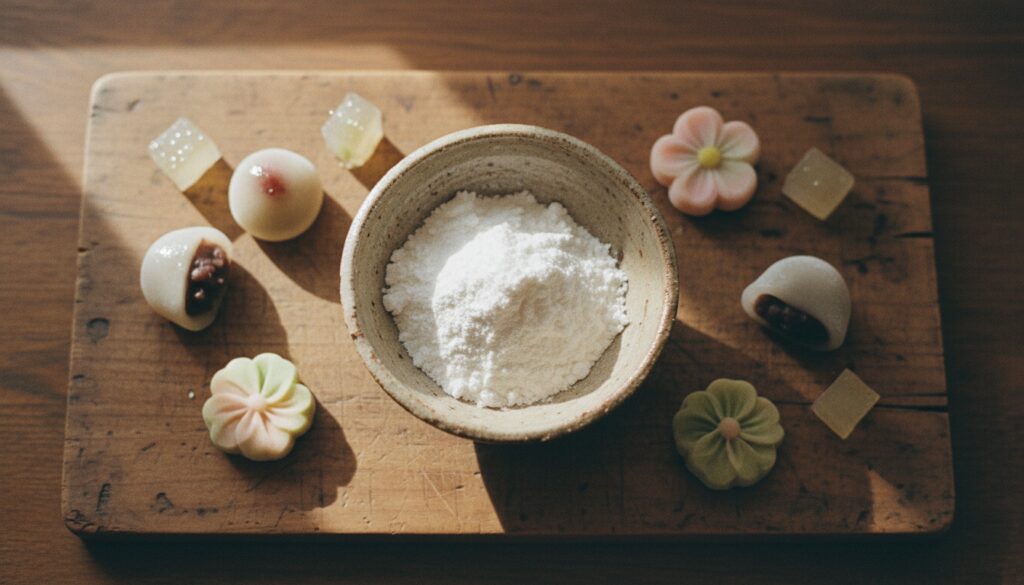 また、最中の皮や練り切りの打ち粉としても使用され、べたつきを防ぎながら滑らかな仕上がりを実現します。